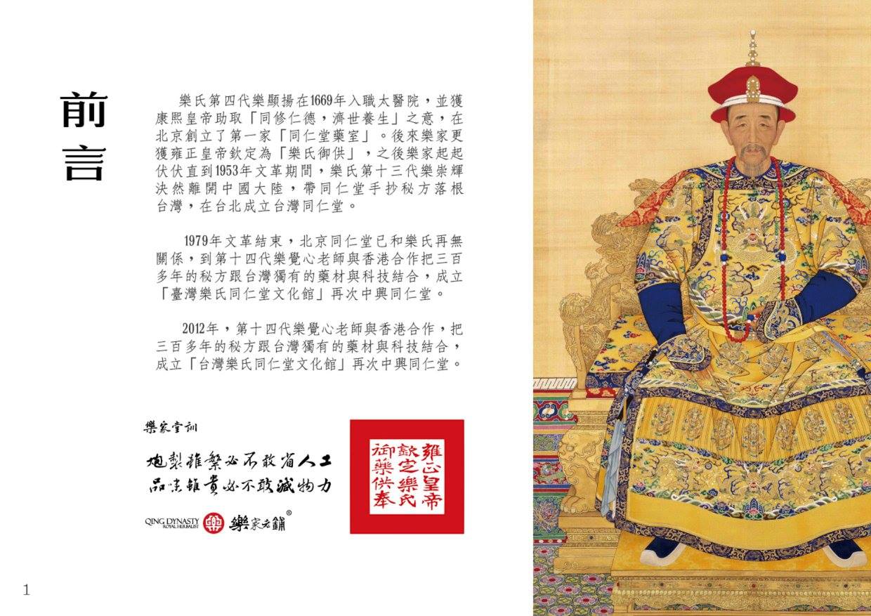 台灣樂氏同仁堂創立於清康煕八年(西元1669年),至今已有將近340年的歷史,而自雍正元年受到欽定,開台供奉大清王朝「宮廷御用藥品」,經歷八代皇帝共188年。